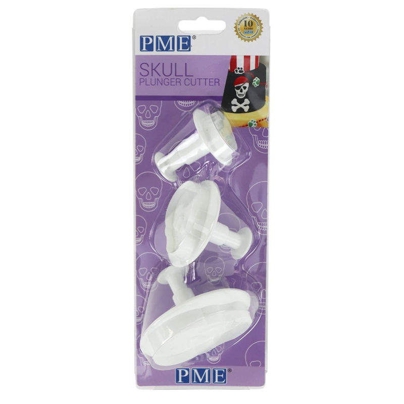 OverzichtDe PME skull plunger cutter set is ideaal voor het maken van griezelige doodshoofd decoraties voor Halloween of griezelfeestjes. De set bestaat uit drie verschillende maten uitstekers die perfect zijn voor taarten, cupcakes, koekjes en meer.