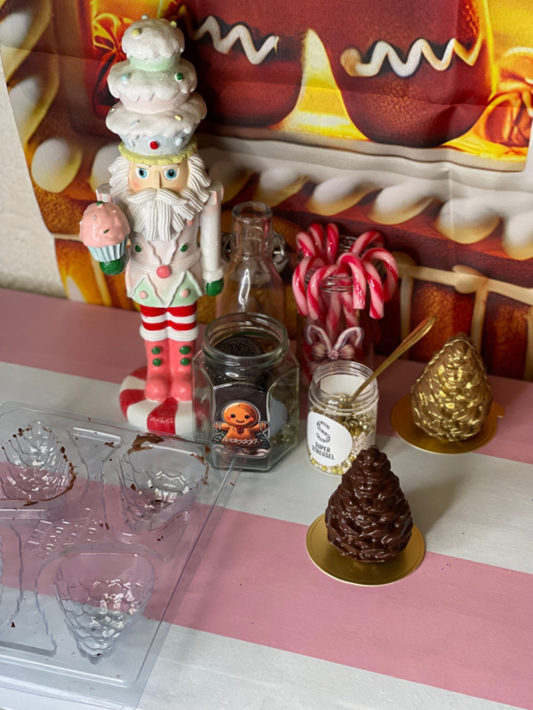 En voilà: een perfecte 3D denneappel van chocolade! Maak op deze manier twee helften en plak deze (evt. gevuld) aan elkaar met gesmolten chocolade.
